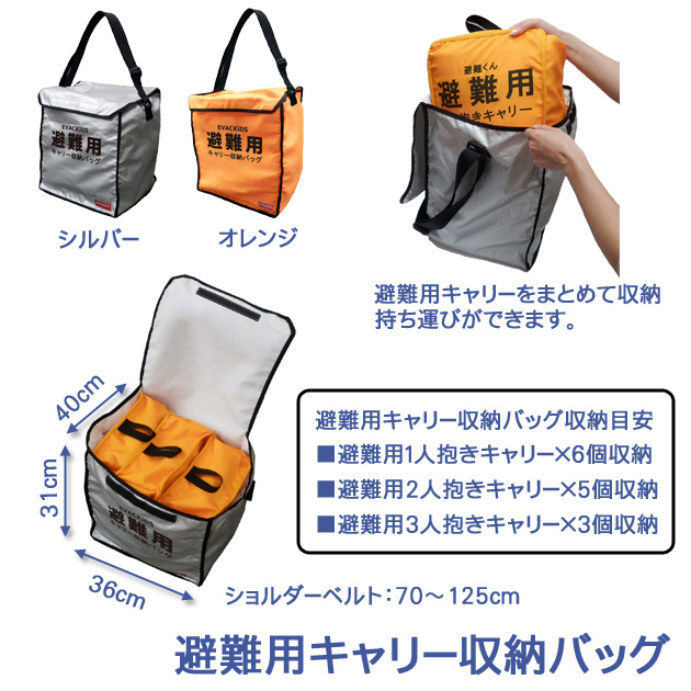 TOP 救助用資機材救助搬送具幼児搬送具 避難用キャリー収納バッグ 価格: ¥7,700 (税込) 販売期間: カラー: 選択してください オレンジ シルバー 数量: 個 カラー在庫オレンジ在庫ありシルバー在庫あり 返品についての詳細はこちら レビューはありません 「避難くん」シリーズの避難用抱っこひもをまとめて収納・持ち運びができる バッグ。面ファスナー留めなので開閉がしやすいのが特徴です。 長さ調節が可能な肩掛け式なので素早く持ち運べ、両手があくので災害時に 便利です。表地は暗闇でも視認性の高いシルバー色で、防炎加工も施されている ので火の粉からの燃え移りを抑制します。 災害時に必要な物を入れておく非常用持ち出し袋としても使えます。 避難用3人抱きキャリーは3個、 2人抱きキャリーは5個、 1人抱きキャリーは6個収納できます。 カラーもオレンジ/シルバーから選べます。 ■製品仕様 サイズ :縦40×横36×高さ31cm ショルダーベルト/70~125cm 重量 :445g(バッグ容量:44リットル) 素材 :ポリエステル100%(表地は防炎協会認定の防炎加工品) カラー :オレンジ/シルバー 関連商品:他にもこんな商品があります。 安全背負い搬送具おんぶらっく ¥22,000(税込) 乳幼児用ずきん(専用袋付き) ¥3,465(税込) 避難用2人抱きキャリー ¥19,800(税込) 避難用3人抱きキャリー ¥34,650(税込) 避難用1人抱きひも式キャリー ¥10,670(税込) 避難用1人抱きウエストベルトキャリー ¥13,200(税込) 避難用フード付きポンチョ ¥10,780(税込) 避難用ベビーポンチョ ¥4,180(税込)