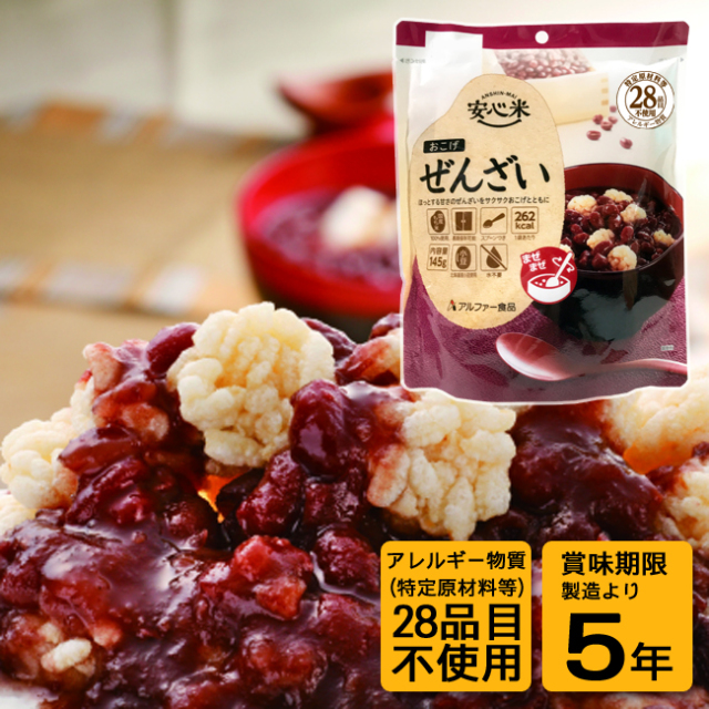 TOP 非常用食料アレルギー対策食料 非常用食料補助食・携帯食 お役立ち商品アウトドア・レジャー アレルゲンフリー食品 安心米おこげ ぜんざい(30袋入/箱) 価格: ¥15,540 (税込) 販売期間: 数量: 箱 在庫 在庫あり 返品についての詳細はこちら レビューはありません 調理不要で国産のもち米をひと口サイズにして揚げました。 お湯も水も必要ないおこげのスナックです。 長期保存が可能なので災害時の非常食としてはモチロン アウトドア等での携帯食、おやつとして! 食べやすい一口サイズのおこげのスナックですので 誰でも美味しくいただけます。 ■安心米おこげ:ぜんざいの召し上がり方 ●お好みでぜんざいを温めても美味しくいただけます。 ぜんざいを温める場合:3~5分湯煎するか、深めの耐熱容器に移して ラップをし、レンジで温めてください。 目安時間:600Wで1分、500Wで1分半です。 ※袋のままレンジには入れないでください。 ※やけどには十分ご注意ください。 ■安心米おこげ:ぜんざいの仕様 内容量:145g(ぜんざい:125g・おこげ20g) 入り数:30袋入り/箱 原材料:■ぜんざい:砂糖(国内製造)、小豆、食塩 ■おこげ:もち米(国産)、植物油、食塩 /酸化防止剤(ビタミンE) アレルギー(アレルギー物質)28品目不使用 賞味期限:製造より5年 保存方法:直射日光および高温多湿を避けて常温で保存してください。 30袋入り箱サイズ・重量:約410×310×230mm・約5.8kg 製造者:アルファー食品株式会社 【栄養成分表記(1袋あたり)】 エネルギー たんぱく質 脂 質 炭水化物 食塩相当量 262kcal 4.8g 4.5g 50.5g 0.4g 関連商品:他にもこんな商品があります。 安心米おこげ カレー味(30袋入/箱) ¥11,970(税込) 安心米おこげ コンソメ味(30袋入/箱) ¥11,970(税込) パワーフルーツキャンディ6年保存 ¥5,184(税込) ~ ビスコ保存缶(10缶入/箱) ¥6,800(税込) 在庫切れ えいようかん(20箱:60g×5本/箱) ¥14,240(税込) 尾西のミルクスティック(30袋入/箱) ¥10,820(税込)