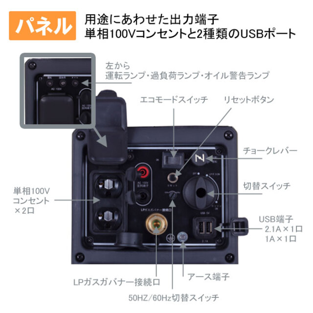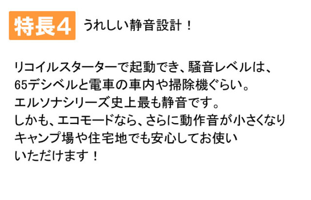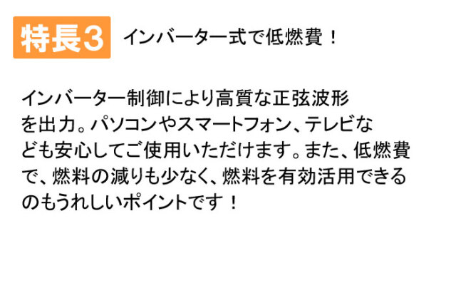 | エルソナはガスとガソリンの2つの燃料が使えます。 LPガス供給地域なら、ご自宅に元々ある燃料を使って 発電できます。LPガスは、長期保存でき、エンジンが 汚れにくいなどのメリットがあります。また、LPガス ガソリンの2つの燃料が使えるので、どちらかの燃料が なくなっても使えて安心です! |