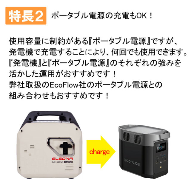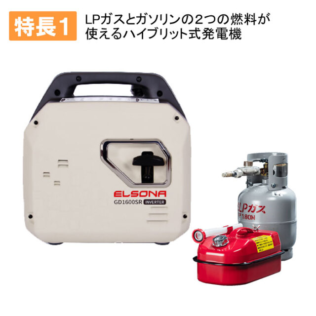 | 「エルソナシリーズ」は、LPガスとガソリン2つの燃料が使える ハイブリッド式発電機です。 小型で移動可能ながら幅広い電源に対応し、停電対策やBCP(事業継続計画) やアウトドアに活躍します。 エルソナGD1600SRは、エルソナシリーズ最軽量なので軽くて持ち運べる ポータブル発電機です! GD1600SRは、小型ながらLPガスで1.53kVA、ガソリンで1.7kVAの高出力 なので、日常のアウトドア等から非常時の電源として活躍します。 |
