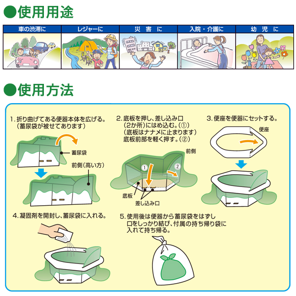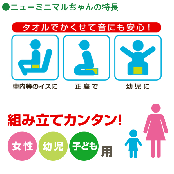 TOP 防災啓発商品 災害対策品携帯トイレ 備蓄用資機材非常用トイレ用品 お役立ち商品アウトドア・レジャー ミニマルちゃん(3回分セット) 価格: ¥660 (税込) 販売期間: 数量: セット 在庫 在庫切れ 返品についての詳細はこちら レビューはありません ●女性(大人)から幼児まで、座って使える携帯簡易トイレです。 ●凝固剤でオシッコを素早く固め臭いを包みます。 ●組み立て簡単、持ち運びが手軽です。 ●スカートやバスタオルで隠せ、音も気になりません。 ●蓄便袋の取り替えただけで本体は繰り返し使えます。 ●凝固した尿は水を加えるだけで簡単にトイレに流せます。 ●大きな人でも安心です。(垂直耐荷重強度80kg) ■ニューミニマルちゃん製品仕様 商品名:ニューミニマルちゃん3回分セット サイズ:組み立てサイズ / W160×H120×D250mm パッケージサイズ / W185×H255×D30mm 蓄便袋 / W680×H540mm(ヒモ部40mm含む)厚さ0.05mm 重 量:105g 素 材:便器・便座 / ダンボール 便凝固剤(殺菌剤入) / 高分子吸水樹脂、食添用殺菌剤 蓄便袋、持ち運び袋 / ポリエチレン ■セット内容 便器・便座:各1、 便凝固剤(殺菌剤入)、蓄便袋、持ち運び袋 各3入 ■生産国:日本製 関連商品:他にもこんな商品があります。 サニタクリーン 簡単トイレセット ¥1,045(税込) サニタクリーン1枚袋入り(100セット) ¥27,500(税込) 緊急トイレ プルプル(3枚入×2セット) ¥1,276(税込) 在庫切れ 水・不要せいけつさん10回分 ¥3,300(税込) 在庫切れ 水・不要せいけつさん20回分 ¥5,500(税込) 在庫切れ