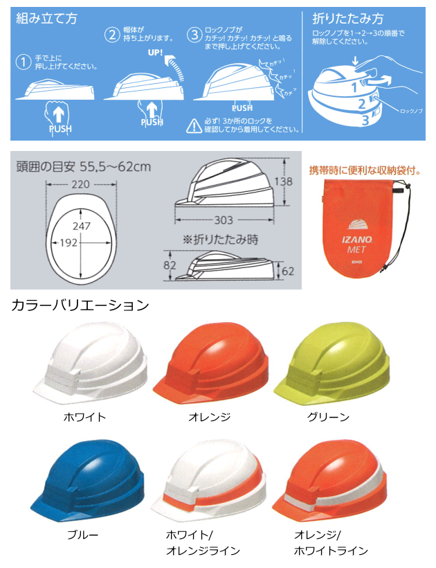 TOP 避難用資機材ヘルメット 非常持出袋帰宅支援セット 災害ボランティア装備品 防災用ヘルメット イザノメット 価格: ¥5,478 (税込) 販売期間: カラー: 選択してください ホワイト オレンジ グリーン ブルー ホワイト/オレンジライン オレンジライン/ホワイト 数量: 個 在庫 在庫あり カラーホワイトオレンジグリーンブルーホワイト/オレンジラインオレンジライン/ホワイト 返品についての詳細はこちら レビューはありません ※写真のカラーは、オレンジ/ホワイトラインです。 ※収納時の容量が使用時の約半分になります。 性能、プロ仕様。収納、ハーフサイズ。 備蓄性・携帯性に優れ、 平常時の作業に使える、新しい防災用ヘルメット! ■製品仕様 国家検定品 :飛来落下物、墜落時保護 [電気用使用不可] 対応頭周囲 :55.5~62cmまで対応 使用時サイズ:220×303×138mm 収納時サイズ:220×303×82mm 材 質 :ABC樹脂製 重 量 :約450g カラー :ホワイト/オレンジ/オレンジライン/ホワイトライン ※取り寄せ商品となりますので、納期にお時間を頂く場合がありますのでご了承ください。 関連商品:他にもこんな商品があります。 防災キッズメット ¥4,543(税込) コンパクメット ¥6,270(税込) タタメットBCP ¥4,730(税込) 防災ヘルメットMN-1L型 標準小売価格: ¥3,190(税込) ¥2,200(税込)