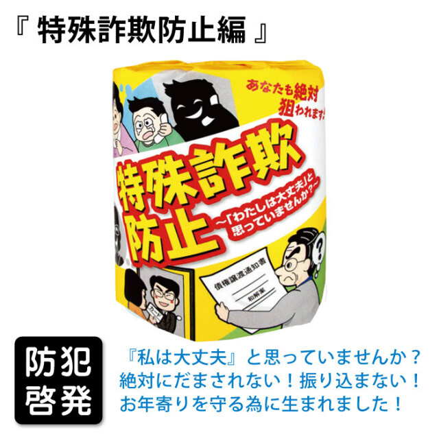 TOP 防災啓発商品 備蓄用資機材非常用トイレ用品 防犯関連商品交通安全グッズ お役立ち商品 啓発用トイレットペーパー【防犯編】(100巻/箱) 価格: ¥8,800 (税込) ~ ¥13,200 (税込) 販売期間: 種類: 選択してください こどもの防災編 ドロボー対策編 飲酒運転7つの落とし穴編 自転車の交通ルール編 高齢者の交通安全編 特殊詐欺防止編 注意!ネットトラブル編 特殊詐欺防止編BOX 価格: - 数量: 箱 在庫 在庫あり 種類価格こどもの防災編¥13,200(税込)ドロボー対策編¥13,200(税込)飲酒運転7つの落とし穴編¥13,200(税込)自転車の交通ルール編¥13,200(税込)高齢者の交通安全編¥13,200(税込)特殊詐欺防止編¥13,200(税込)注意!ネットトラブル編¥13,200(税込)特殊詐欺防止編BOX¥8,800(税込) 返品についての詳細はこちら レビューはありません ●防犯訓練、交通安全教室に ※薄型BOX特殊詐欺防止40W100入製品仕様 ロール(ペーパー)サイズ:200×210mm(40組入) 個装サイズ:220×120×高さ35mm 箱サイズ:620×370×高さ460mm 入数:100個入 ※この商品は、取り寄せ商品となりますので、納期に時間を頂きます。 関連商品:他にもこんな商品があります。 啓発用トイレットペーパー【防災編】(100巻/箱) ¥13,200(税込) 啓発用トイレットペーパー【環境編】(100巻/箱) ¥13,200(税込) 啓発用トイレットペーパー【健康編】(100巻/箱) ¥13,200(税込) 着衣型携帯ブランケット ¥550(税込) 在庫切れ スペースブランケット ¥770(税込) 防災手帳 ¥495(税込) サバイバルウォークマニュアル ¥495(税込) 防災マニュアル 我が家の防災対策 ¥495(税込) アルミホイッスル ¥550(税込) 在庫切れ 軍手とタオル圧縮セット ¥550(税込) 非常用圧縮3点セット ¥1,430(税込) LEDライト付緊急ホイッスル ¥1,650(税込) 在庫切れ 緊急用IDカード・カプセルSサイズ ¥1,320(税込) 在庫切れ 緊急用IDカード・カプセルMサイズ ¥1,430(税込) 在庫切れ サニタクリーン1枚袋入り(100セット) ¥27,500(税込) サニタクリーン 簡単トイレセット ¥1,045(税込) ミニマルちゃん(3回分セット) ¥660(税込) 在庫切れ 備食カンパン金平糖入り(24缶入/箱) ¥7,776(税込) 保存用ファイバービスケット(24袋入/箱) ¥7,517(税込)