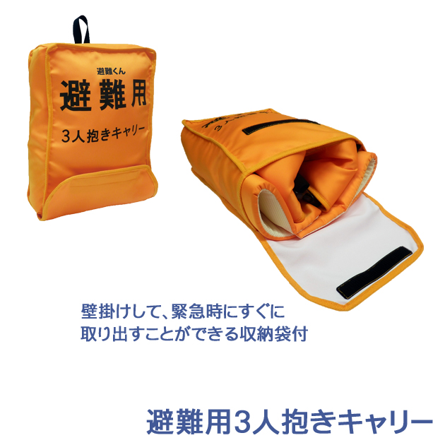 緊急災害時に3人の子供を素速く避難させられる、避難用3人抱きキャリー。両サイドと背中にそれぞれ子供を抱っこすることができ、誰でも簡単に装着できるベストタイプなので3人分の重さを分散します。いつでもすぐに使用できるよう、壁かけ式の収納袋付き。表生地は難燃素材を使用しており、背面には反射テープ付きです。災害時に迅速に避難ができるよう、保育園や保育士をサポートする補助グッズです。限られた時間の中、少ない人数で大勢の子供たちの安全を確保することはとても難しく、ベビーカーやエレベーターが使用できない場合も多くあります。この避難キャリーを使えば、確実に子供の安全を確保でき、素速く避難所への移動が可能になります。災害時に先生に抱かれて避難することで、災害時での子供たちの不安や心配も軽減します。